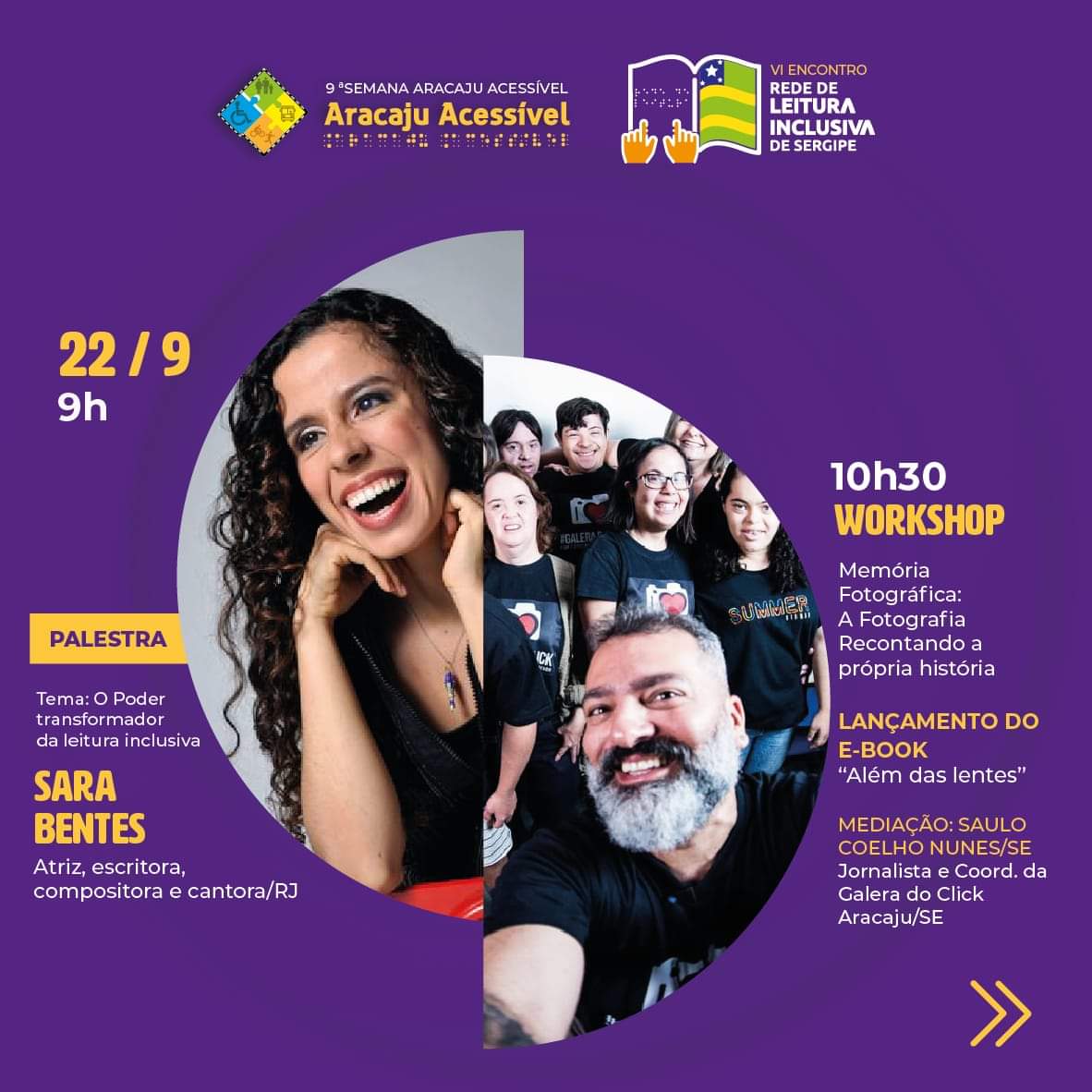 PraTodoMundoVer Card de divulgação com informações em plano de fundo roxo. Na parte superior, as logos da nona Semana Aracaju Acessível e da Rede de Leitura Inclusiva de Sergipe. Ao centro do card, dois semicírculos se sobrepõem, ambos com a parte reta na vertical, com fotos dos palestrantes. Ao lado esquerdo do semicírculo da esquerda, com letras nas cores amarelo e branco, o texto: “22 de setembro às 9 horas”, seguido de faixa amarela com a palavra “Palestra” em roxo. Na sequência: “Tema: O Poder Transformador da Leitura Inclusiva, Sara Bentes, atriz, escritora, compositora e cantora/RJ.” Ao lado direito do semicírculo da direita, as informações em sequência: “10 horas e 30 minutos, Workshop, Memória Fotográfica: A Fotografia Recontando a Própria História, Lançamento do e-book: “Além das Lentes”, Mediação: Saulo Coelho Nunes/SE, Jornalista e Coordenador da Galera do Click Aracaju/SE” e duas setas indicando à direita.