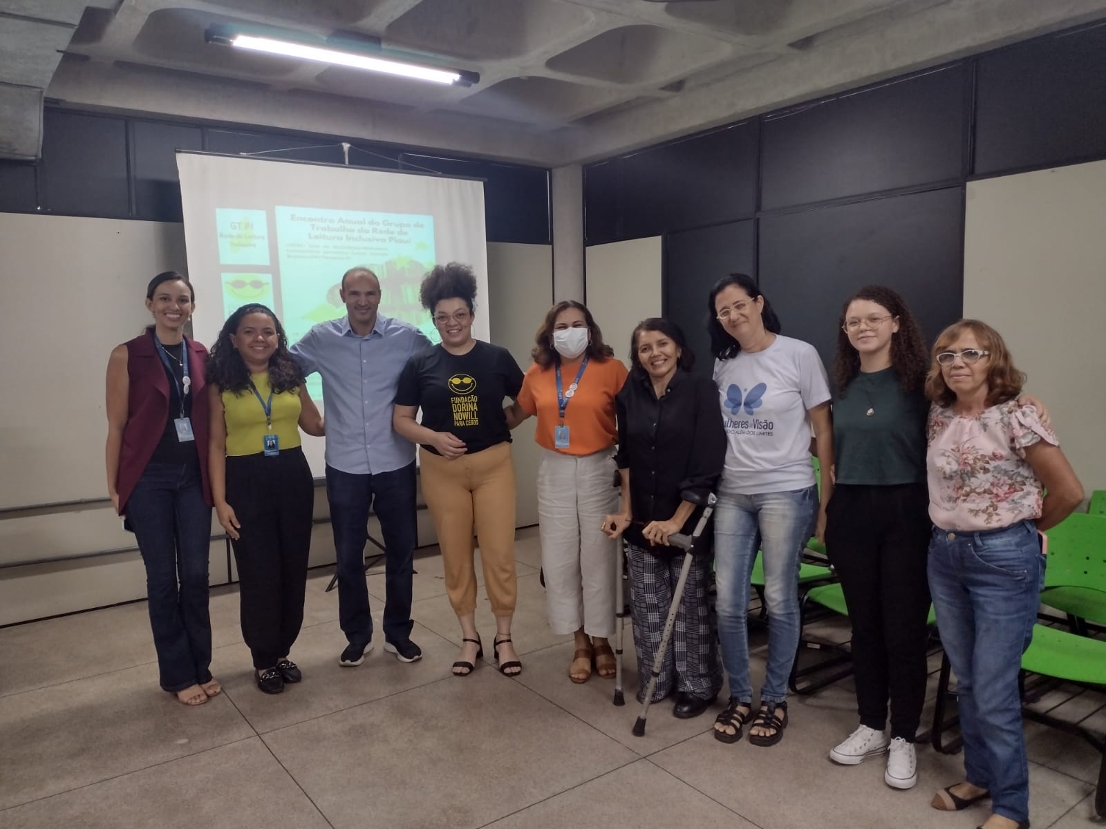 Foto com que mostra 8 mulheres e 1 homem em pé, lado a lado, sorrindo. Atrás do grupo de pessoas há uma parede preta a direita e uma parede bege à esquerda com uma projeção de slide contendo a logo da Fundação Dorina.